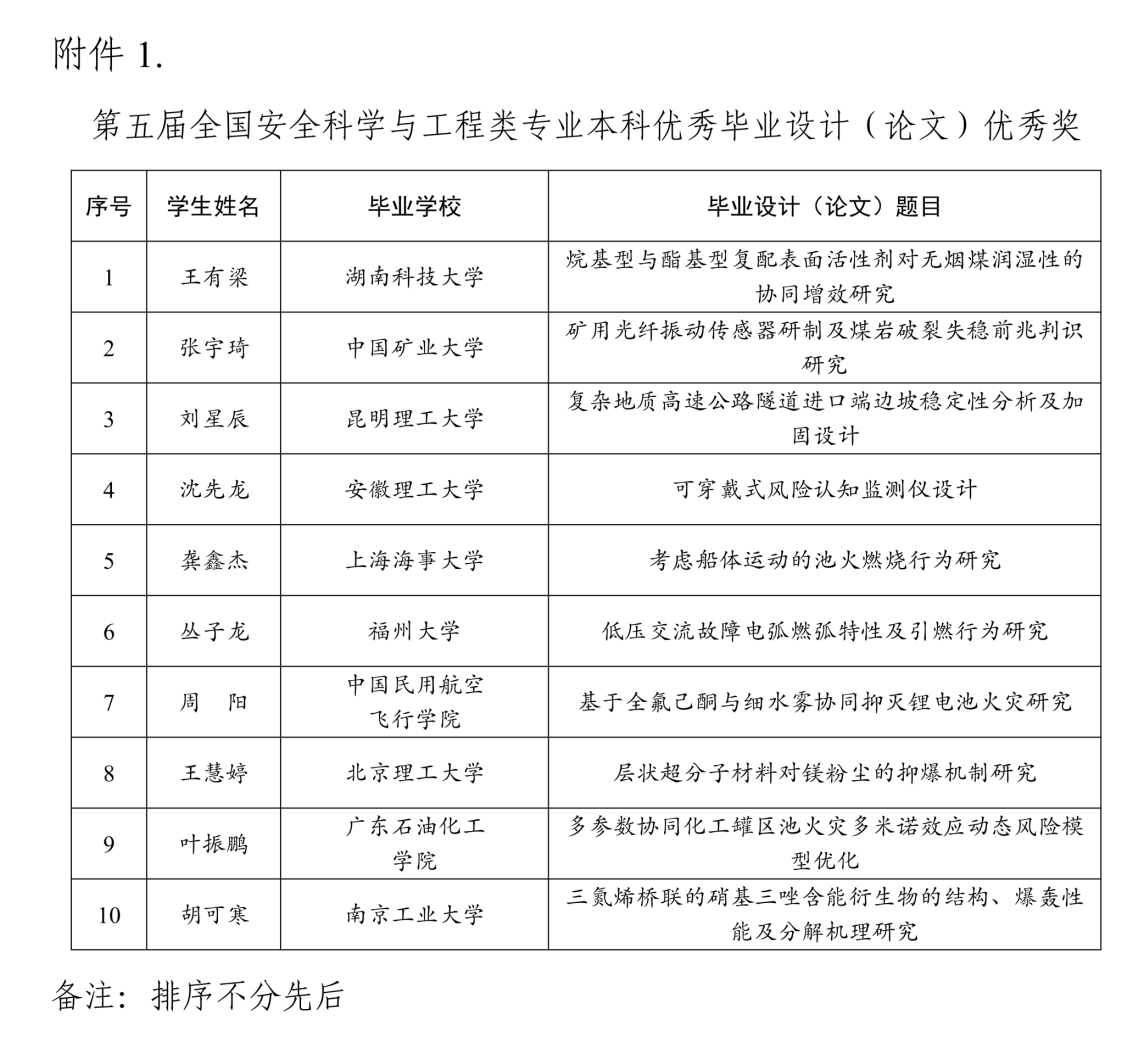 近日,国家安全科学与工程研究院(应急管理部和教育部共建)公布了第五届全国安全科学与工程类专业本科优秀毕业设计(论文)评选结果。该评选由国家安全科学与工程研究院组织,旨在提高安全科学与工程本科专业人才培养质量。评选竞争激烈,采用双盲分组评审、专家组会评的严格筛选机制,从全国众多高校申报的优秀毕业设计(论文)中优中选优,最终仅评选出10篇优秀奖和17篇提名奖。